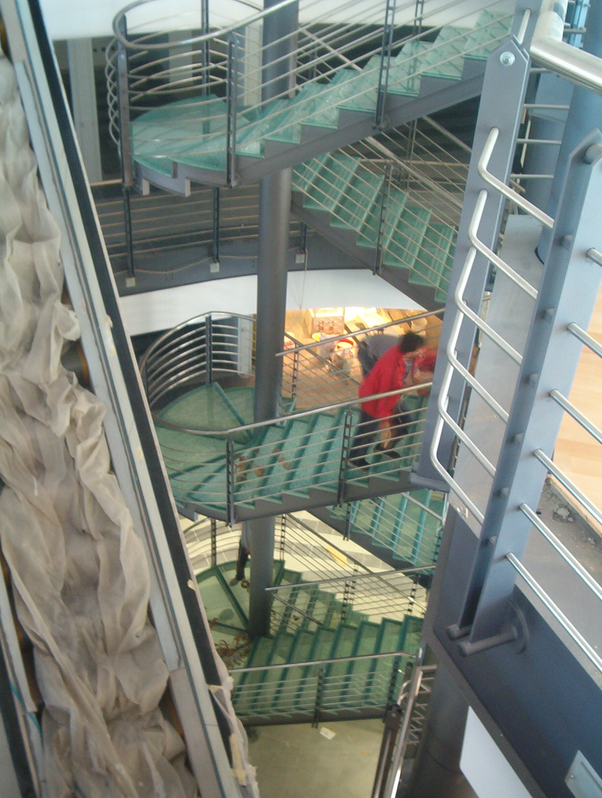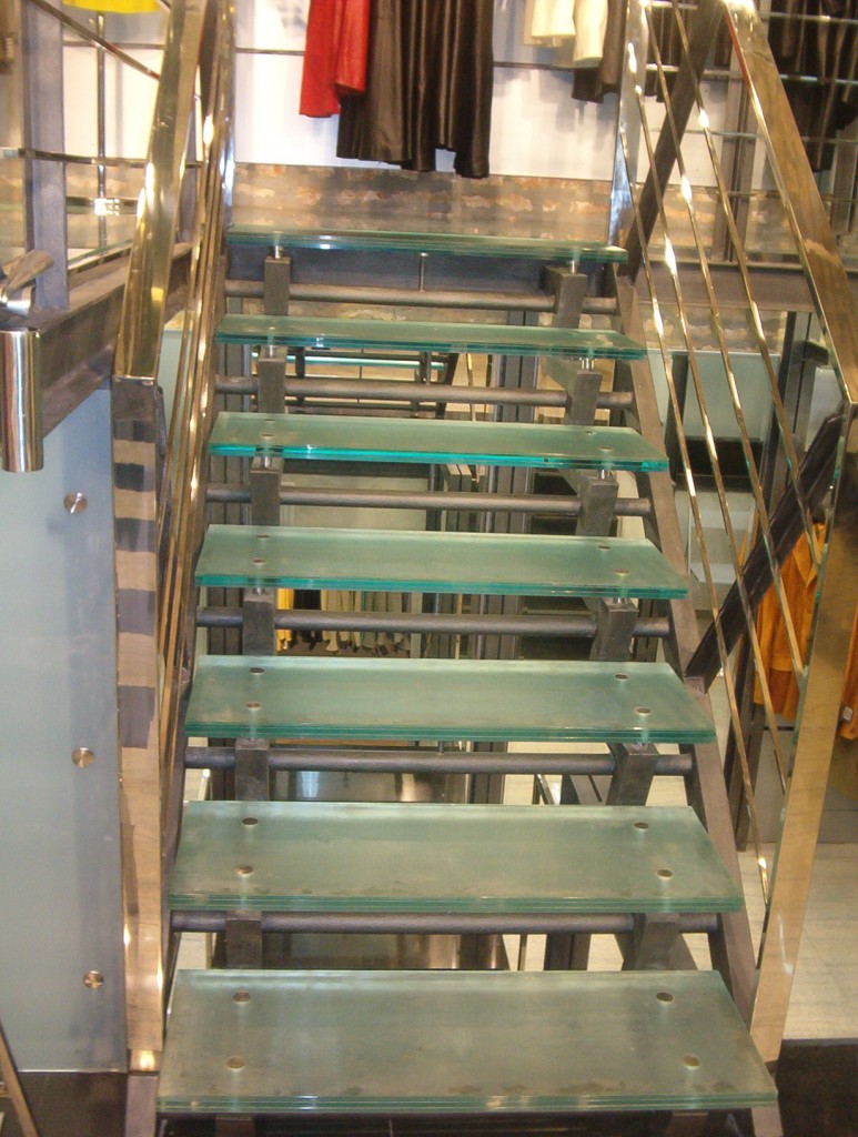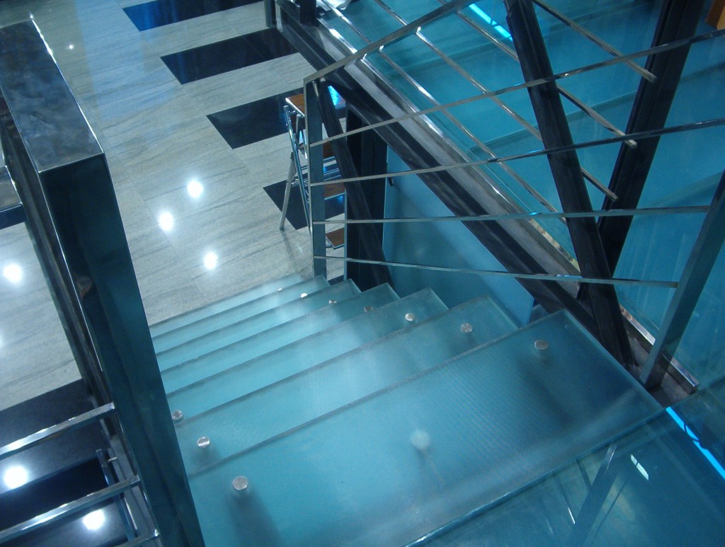 Primer modela staklenih stepenica postavljenog u enterijer poslovnog prostora.